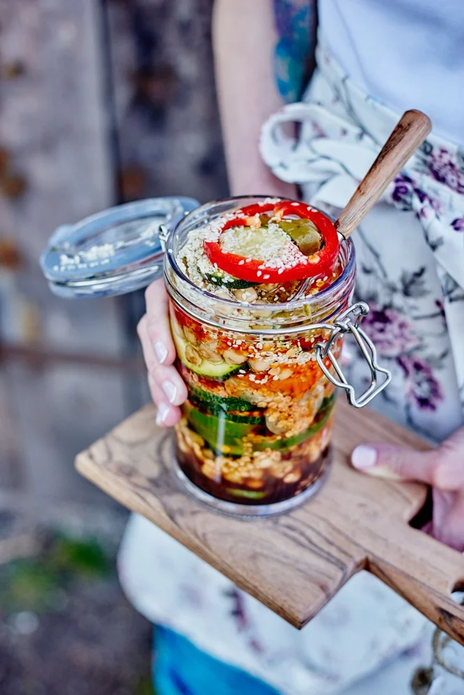5. Takto vrstvite do pohára, až bude zaplnený cca 3 cm pod okraj. To preto, že na úplný záver príde na rad olej, ktorým celú čínu v skle prelejete. Dbajte na to, aby bol pohár suchý. Najmä okraj, aby viečko dokonale tesnilo. Klip hladinu oleja zdvihne. Uschovajte v chlade, ideálne v chladničke a za tri dni môžete čínu zo skla konzumovať. A ako sa táto dobrota je? S trochou humoru siahnite po paličkách a budete mať o zábavu postarané.
