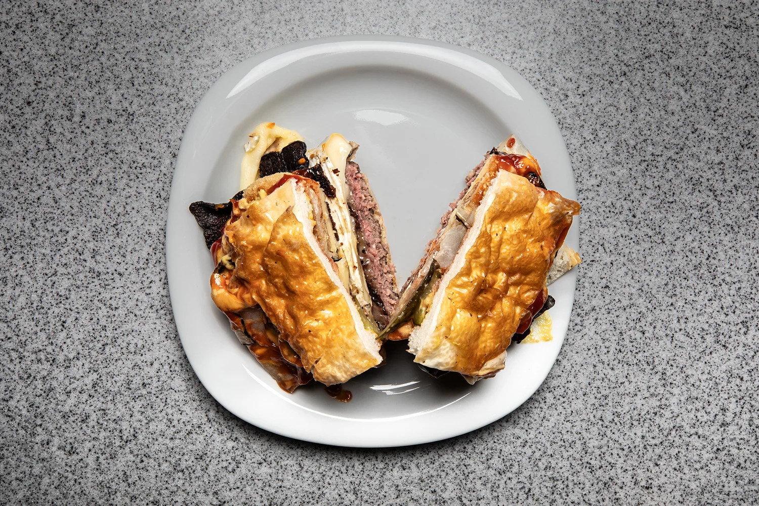 Pre kolegov grilmanov: americký burger s českým twistom. Angus hovädzie mäso, celý kus Hermelínu roztopený navrchu, smažené cibuľové krúžky a k tomu čerstvá cibuľa nakrájaná nahrubo, balíček anglickej údenej slaniny a množstvo omáčok. Žemľa ogrilovaná s roztaveným vyzretým cheddarem. A české nakladané uhorky nakrájané na hrubé plátky.