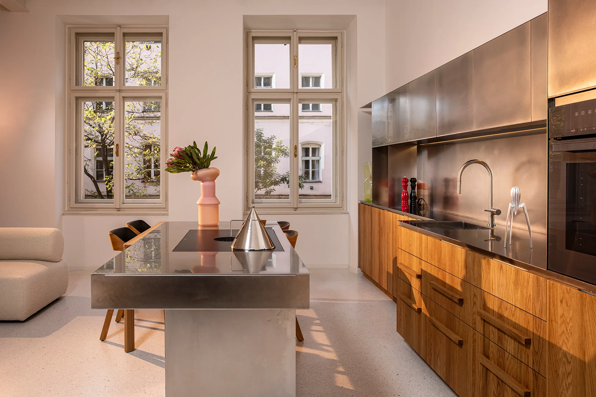 Plynúci priestor v jemných odtieňoch bielej, ktoré kontrastujú s tvrdosťou a surovosťou nerezu a fragmentmi dubového dreva.