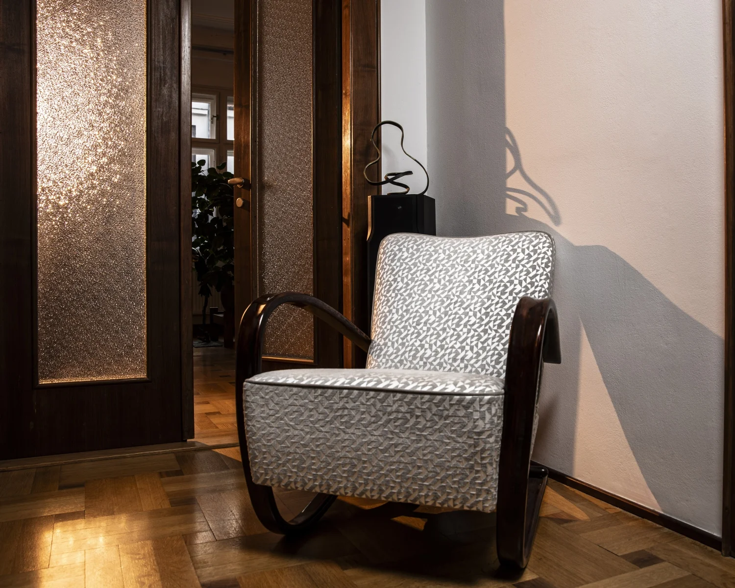 Pôvodné kreslo Halabala H-269, dovezené z mamahotela zo Zlína, kompletne repasované, prečalúnené. Pohodlné veľmi nie je, krásne áno.
