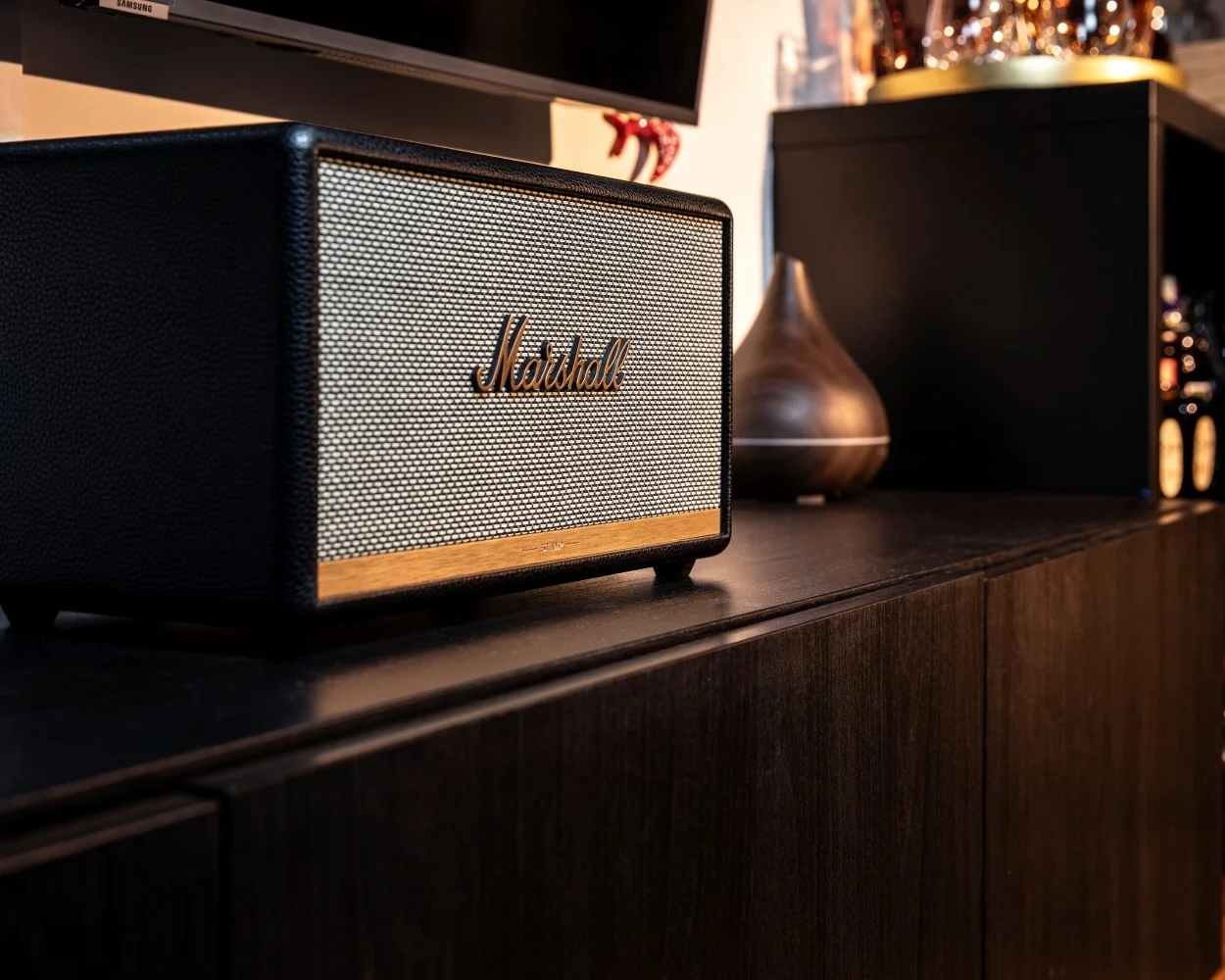 Máme radi kvalitný zvuk, a preto bol reproduktor Marshall skvelou voľbou. Je umiestnený pod televíziou tak, aby sme ho okrem počúvania hudby mohli využiť aj pre zvuk z televízie pri sledovaní filmov.