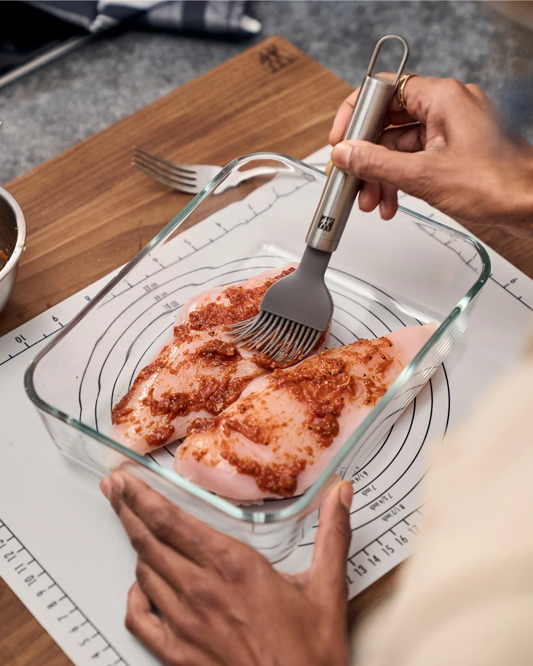Gril predhrejte a kuracie prsia ugrilujte z oboch strán, napríklad na kontaktnom grile ZWILLING ENFINIGY. Aby sa prsia dobre prepiekli a pritom zostali šťavnaté, odporúčame ich vytiahnuť z chladničky včas a negrilovať ich úplne studené. Dosiahnete tak rýchlejšie optimálnu prepečenosť bez vysušenia. Ideálne je kontrolovať teplotu pomocou teplotnej sondy.