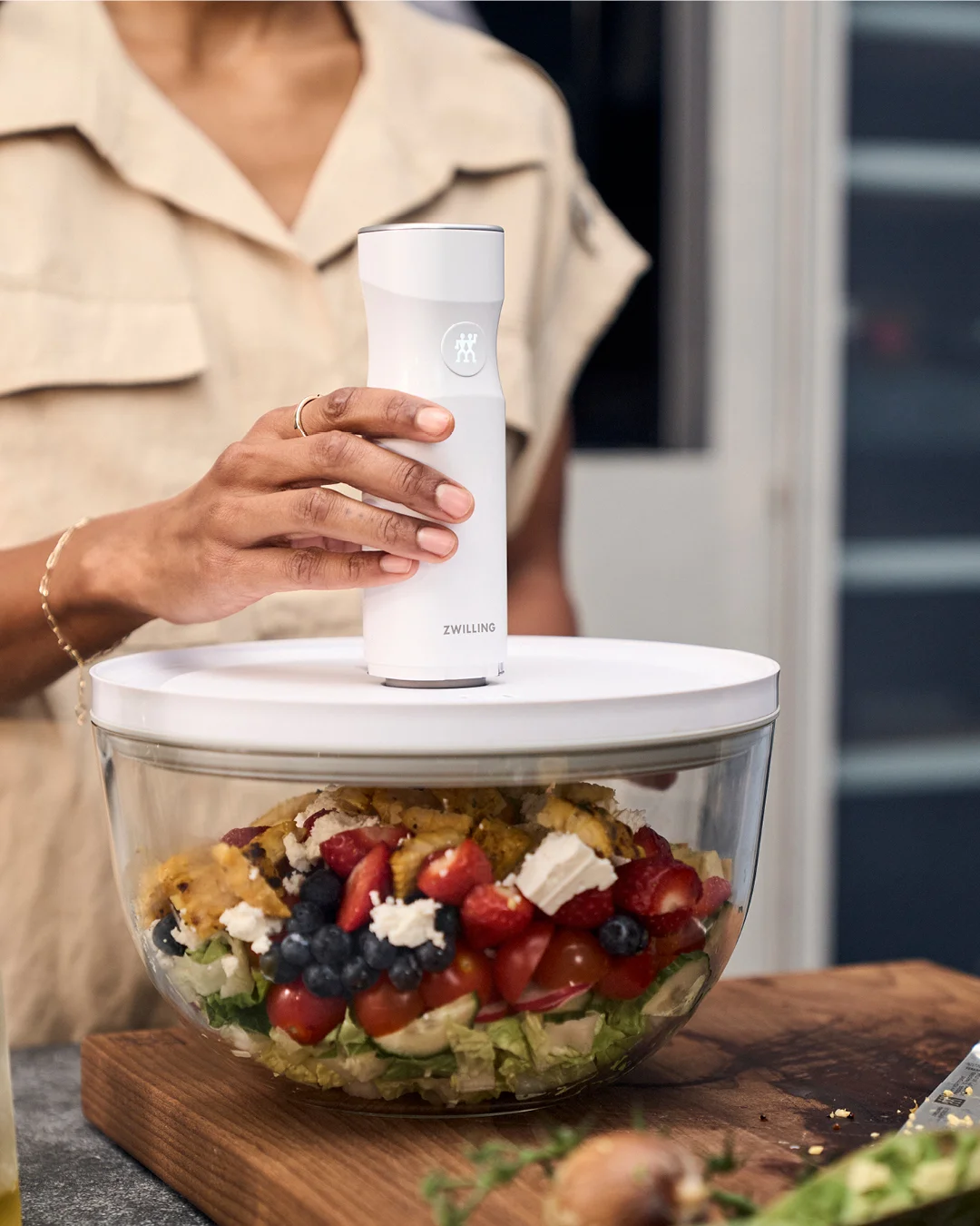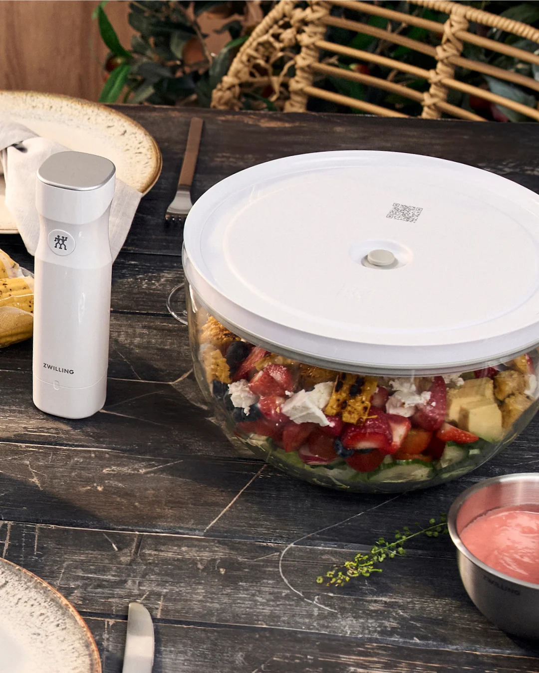 Medzitým si pripravte veľkú vákuovú misku ZWILLING FRESH & SAVE s priemerom 24 cm. Rímsky šalát umyte, osušte a vložte do misky. Uhorku umyte alebo ošúpte, pozdĺžne prekrojte a pomocou krájacieho nástavca Z-Cut z príslušenstva nastrúhajte priamo do misky. Reďkovky očistite, umyte a nakrájajte. Cherry paradajky umyte, prekrojte na polovicu a pridajte do misky. Čučoriedky preberte, umyte a osušte, pridajte ich tiež. Jahody umyte, očistite a podľa veľkosti prekrojte na polovice alebo štvrtiny. Avokáda ošúpte, prekrojte, vyberte kôstku a dužinu nakrájajte. Premiešajte ju so zvyšnou limetkovou šťavou a pridajte do šalátu. Nakoniec rozmrvíte fetu a posypete ňou šalát.