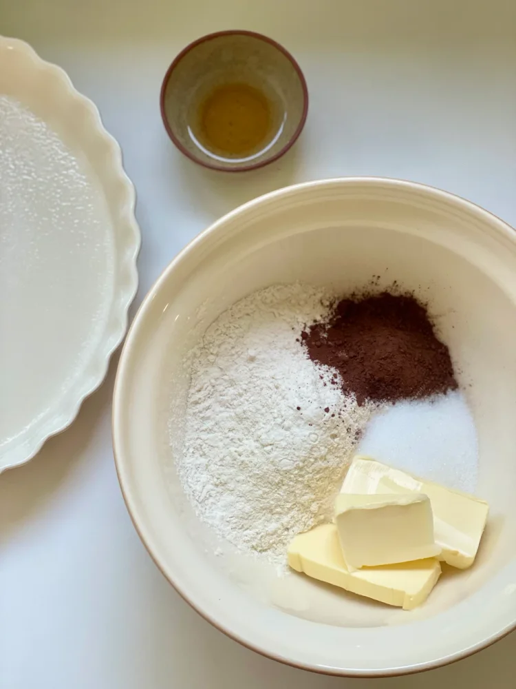 1. Na pečený základ zmiešajte v mise alebo v kuchynskom robote všetky sypké suroviny na cesto a maslo a vytvorte základ na posýpku.