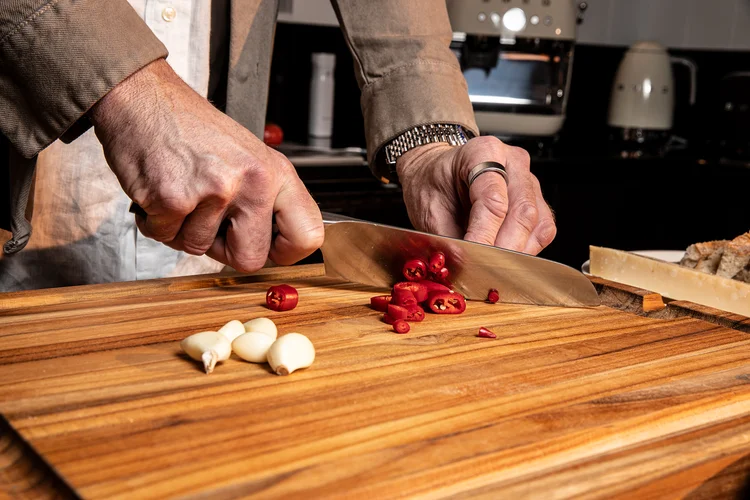 - Na panvici rozohrejte olivový olej a krátko na ňom orestujte cesnak a chilli – len tak, aby cesnak jemne zozlátol, nie aby stmavol.