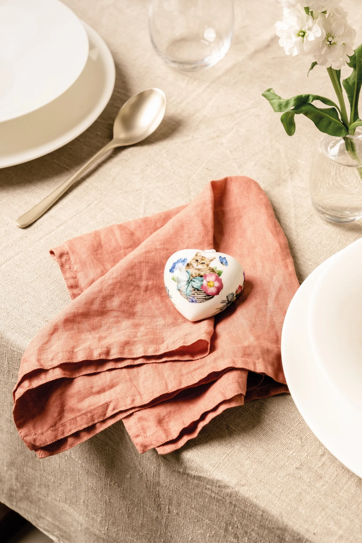 Ozdobte si interiér tradičným porcelánom, z ktorého budete mať radosť nielen na svätého Valentína. Dekorácie v tvare srdca z dielne nemeckej porcelánky Rosenthal zaujme hneď na prvý pohľad! Okrem roztomilého motívu mačiatka v prútenom koši s mašľou hrajúcim jemnými farbami vyniká tiež hladkou glazúrou a blankytne modrou stuhou na zavesenie. Vyšperkujte interiér obývačky, kuchyne alebo napríklad postele do posledného detailu. Závesná ozdoba je tiež ideálnym darčekom pre vášnivého zberateľa. Chýba vašej drahej polovičke presne taký kúsok? Prekvapte ju na sviatok zamilovaných niečim originálnym!