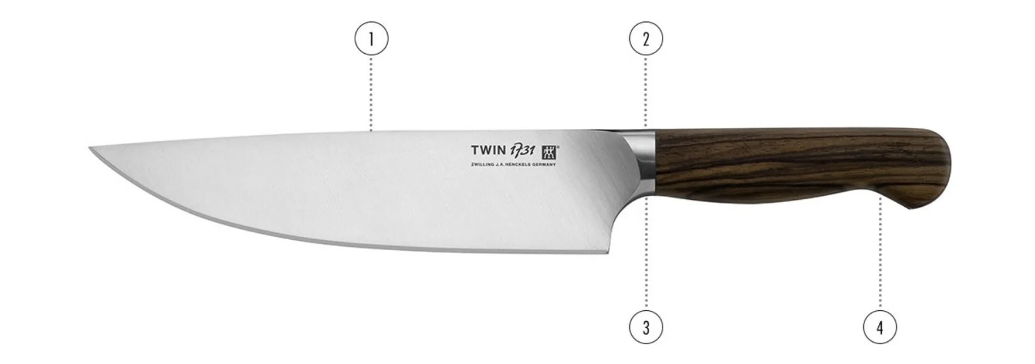 4: Trojvrstvový dizajn rukoväti s hladkým prechodom do čepele. To je nestarnúca klasika pre profesionálne kuchyne.
