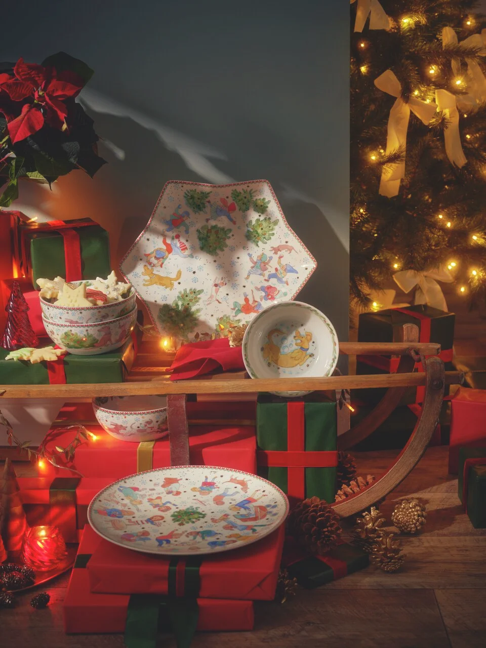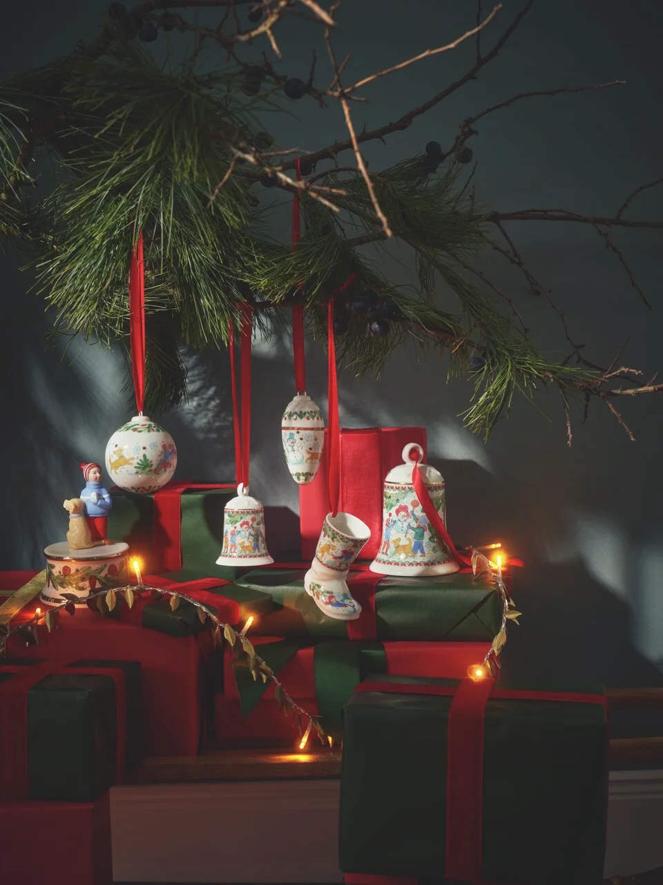 Ako je už zvykom, porcelánová zbierka sa skladá z maľovaných tanierov, šálok, misiek, dóz a dekorácií najrôznejších tvarov. Nechýbajú ani červeno-zlaté lemy na okrajoch. Tým, čím sa však tohtoročná edícia líši od tých predchádzajúcich, je farebnosť a dominancia konkrétnych odtieňov. Popri tradičnej modrej – farbe tieňov na snehu, zimnej oblohy a tajomstva dlhých sviatočných večerov – sa po novom do popredia dostáva smrekovo zelená a svetlohnedá, ktoré evokujú lesné dobrodružstvo v sprievode energického štvornohého priateľa.